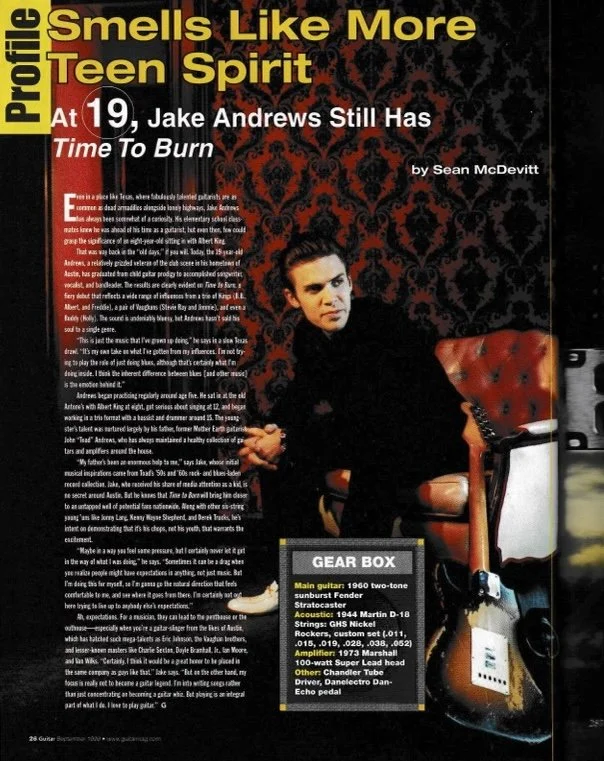 “Even in a place like Texas, where fabulously talented guitarists are as common as dead armadillos alongside lonely highways, Jake Andrews has always been somewhat of a curiosity. His elementary school classmates knew he was ahead of his time as a guitarist, but even then, few could grasp the significance of an eight-year-old sitting in with Albert King. That was back in the “old days,” if you will. Today. The 19-year old Andrews, a relatively grizzled veteran of the club scene in his hometown of Austin has graduated from child guitar prodigy to accomplished songwriter, vocalist and bandleader. The results are clearly evident on Time to Burn, a fiery debut that reflects a wide range of influences from a trio of Kinds (B.B, Albert and Freddie), a pair of Vaughans (Stevie Ray and Jimmie), and even a Buddy (Holly). The sound is undeniably bluesy, but Andrews hasn’t sold his soul to a single genre.”
